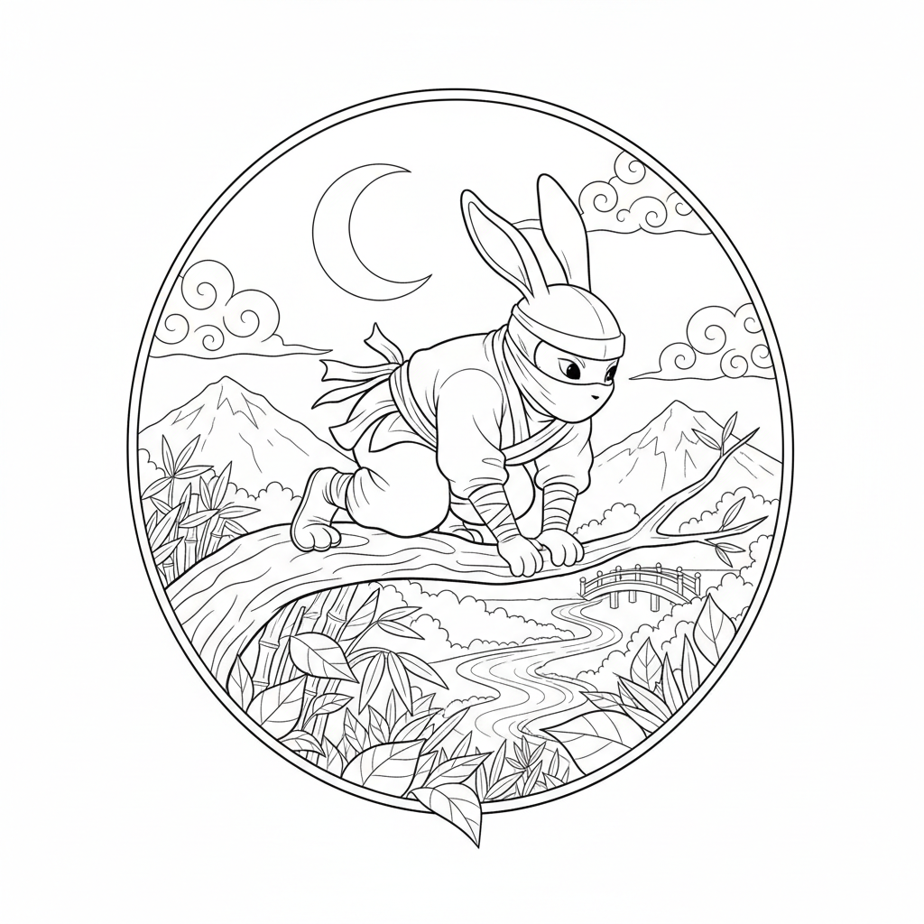 Beautiful rabbit ninja stealth coloring page for kids and adults. Free to download and print.