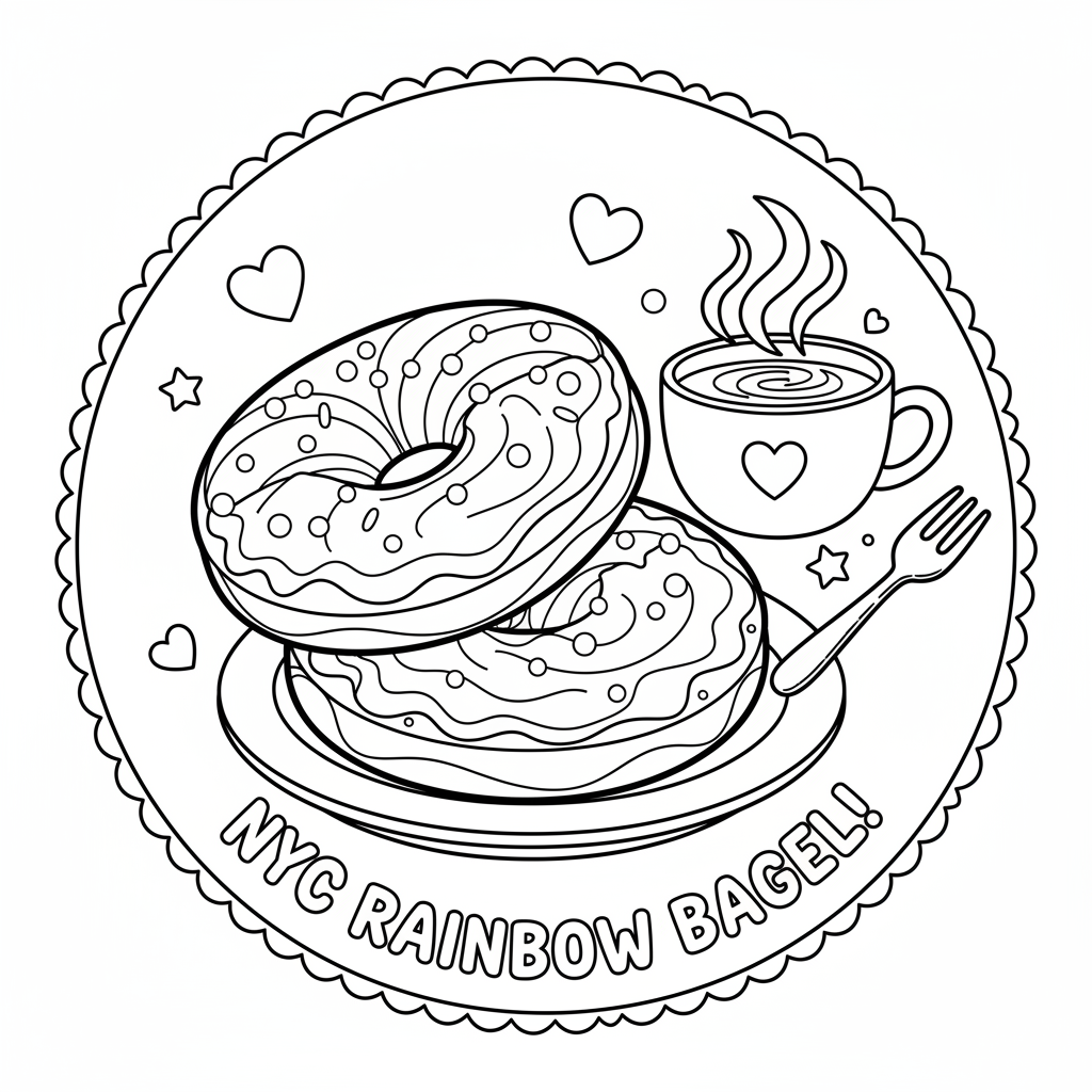 A delightful rainbow coloring page featuring rainbow bagel breakfast food colorful unique NYC. Perfect for kids and adults who love coloring!