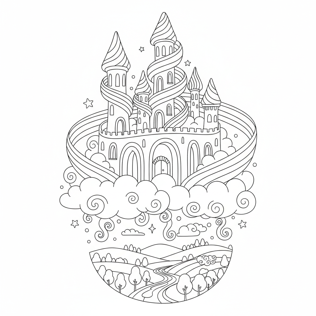 Beautiful rainbow castle fantasy coloring page for kids and adults. Free to download and print.