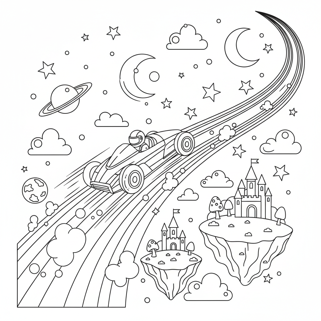 Beautiful rainbow road driving coloring page for kids and adults. Free to download and print.