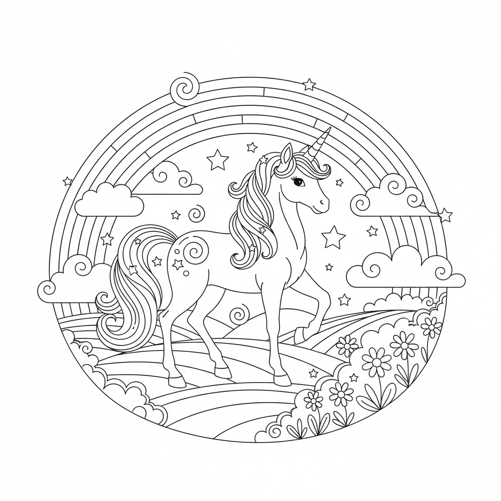 Beautiful rainbow unicorn scene coloring page for kids and adults. Free to download and print.