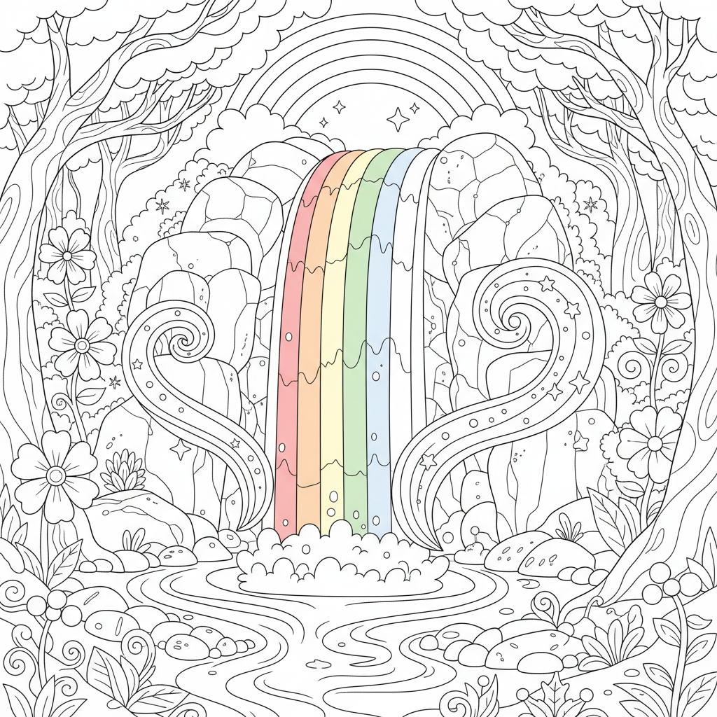 Beautiful rainbow waterfall magical coloring page for kids and adults. Free to download and print.