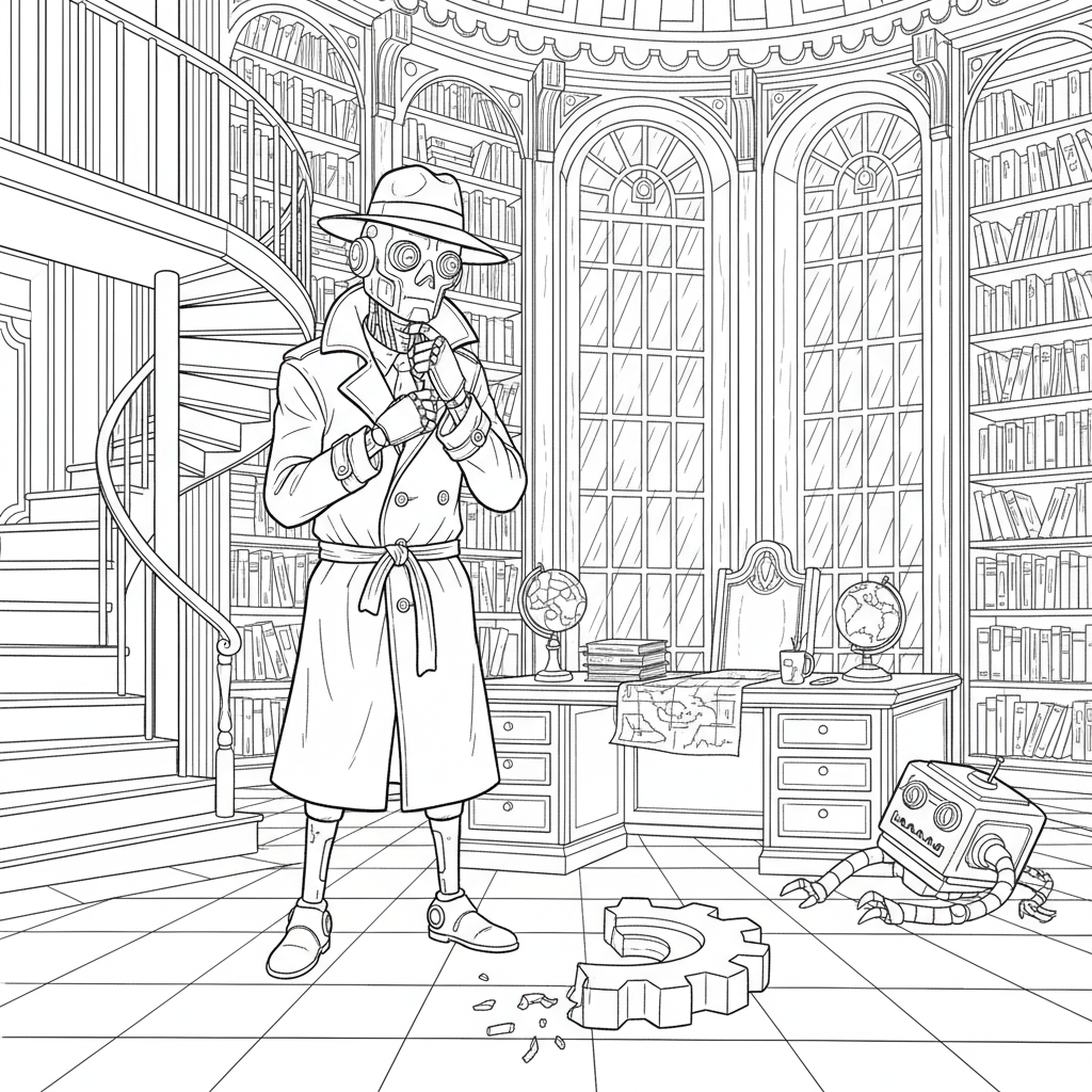 Beautiful robot detective mystery coloring page for kids and adults. Free to download and print.