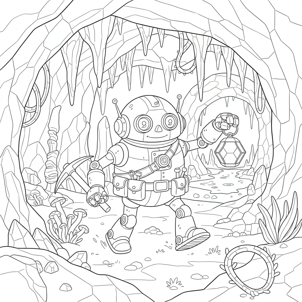 Beautiful robot explorer cave coloring page for kids and adults. Free to download and print.