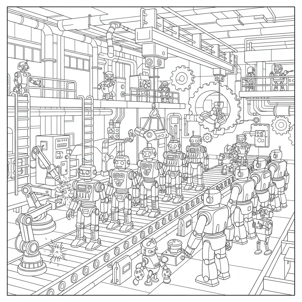 Beautiful robot factory assembly coloring page for kids and adults. Free to download and print.