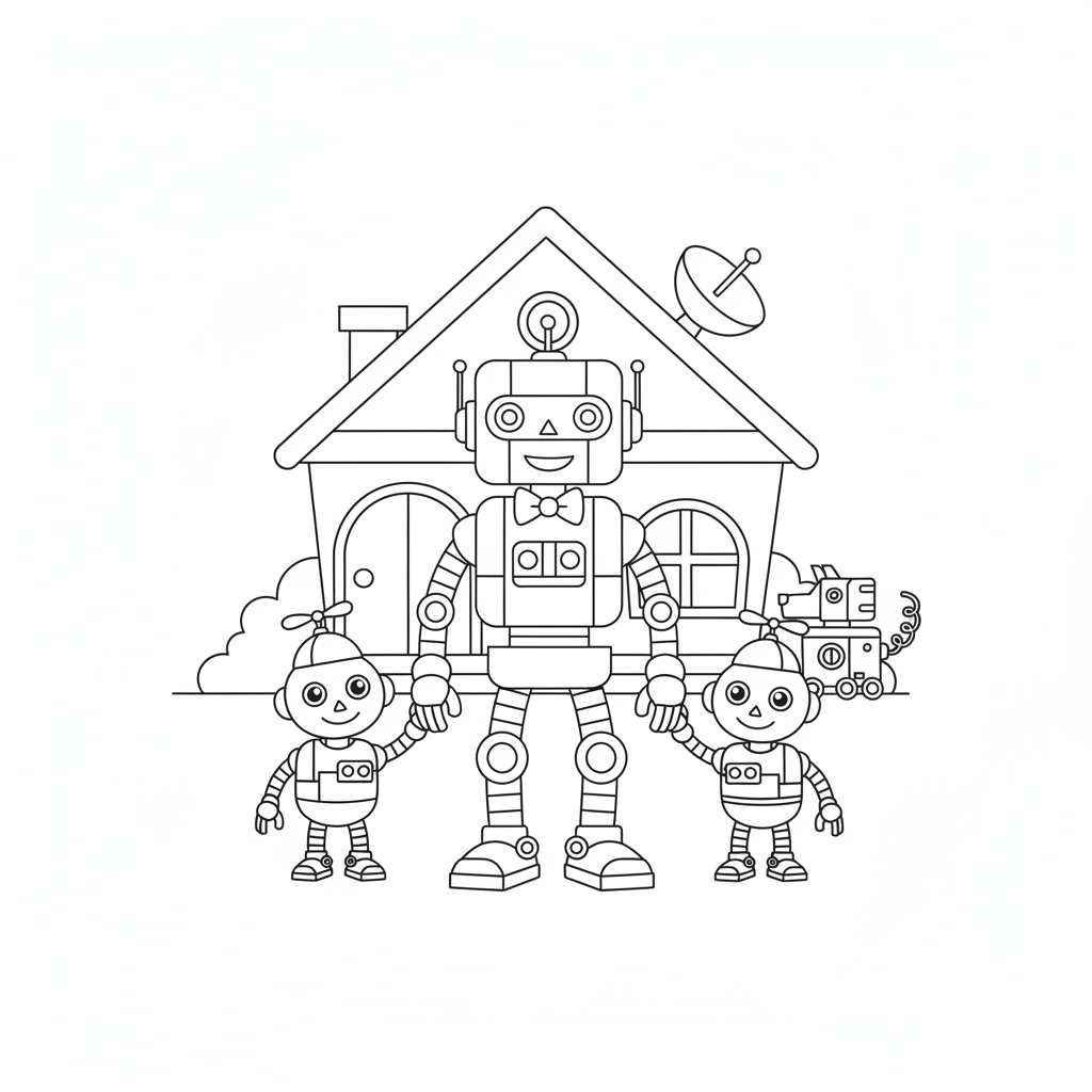 A delightful robot coloring page featuring robot family parent children mechanical household cute. Perfect for kids and adults who love coloring!