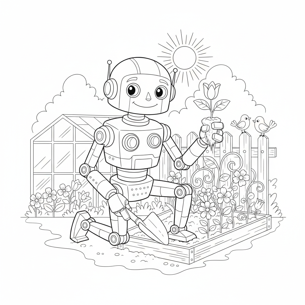 Beautiful robot gardener planting coloring page for kids and adults. Free to download and print.