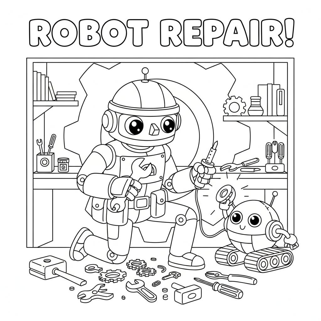 A delightful robot coloring page featuring robot repair technician fixing tools maintenance work. Perfect for kids and adults who love coloring!