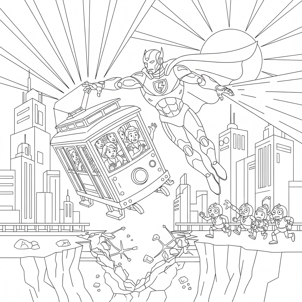 Beautiful robot superhero saving day coloring page for kids and adults. Free to download and print.