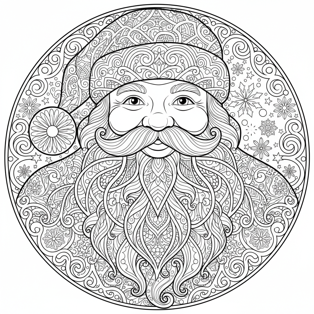 Detailed ornate Santa Claus portrait with intricate beard patterns mandala style for adults