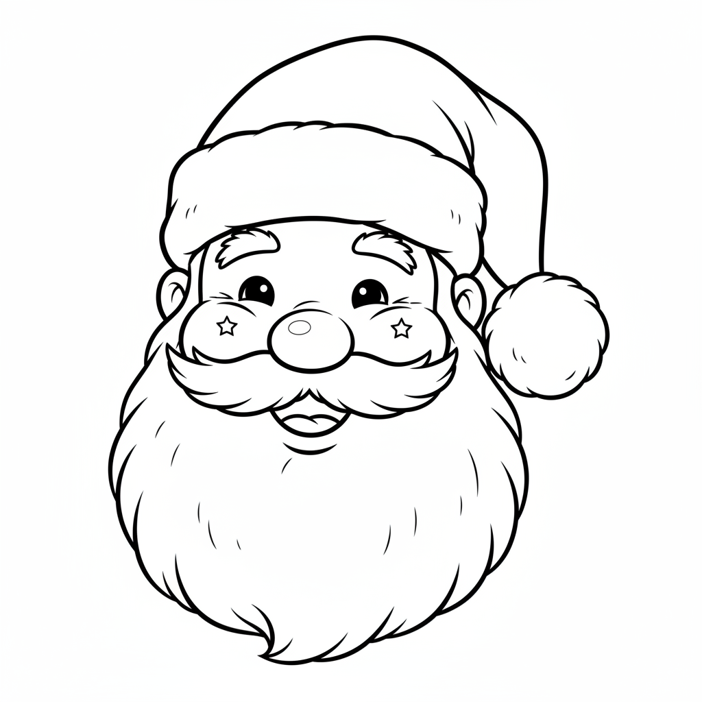 A delightful santa coloring page featuring jolly Santa Claus face with rosy cheeks twinkling eyes and fluffy white beard close-up portrait. Perfect for kids and adults who love coloring!