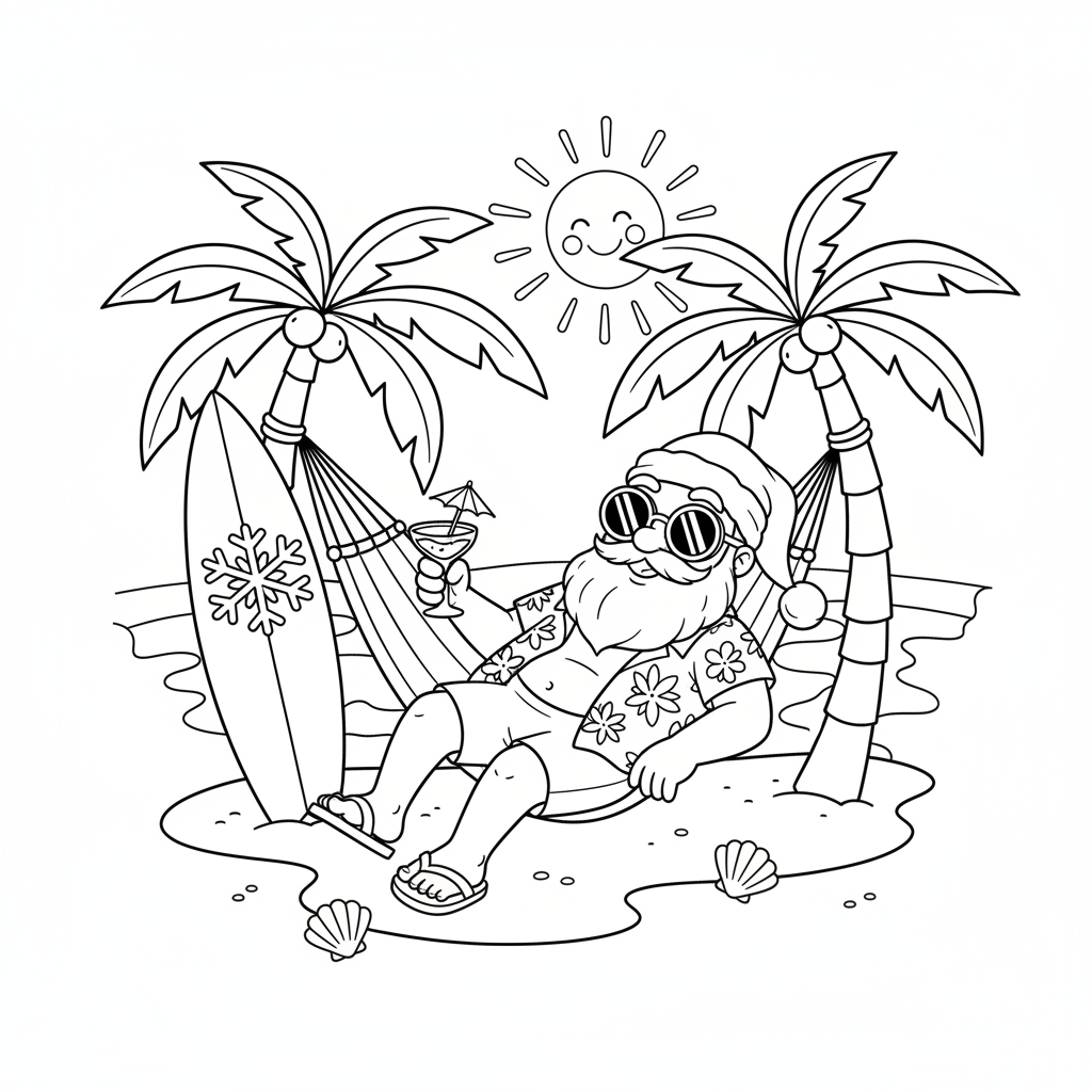 A delightful santa coloring page featuring Santa relaxing on tropical beach vacation wearing sunglasses and flip flops with surfboard. Perfect for kids and adults who love coloring!
