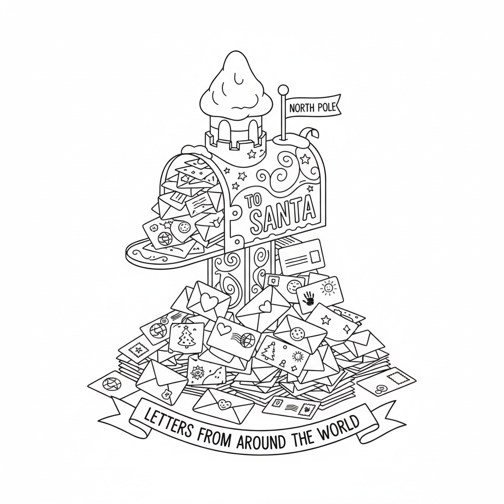 A delightful santa coloring page featuring Santas magical mailbox overflowing with letters and postcards from children worldwide. Perfect for kids and adults who love coloring!