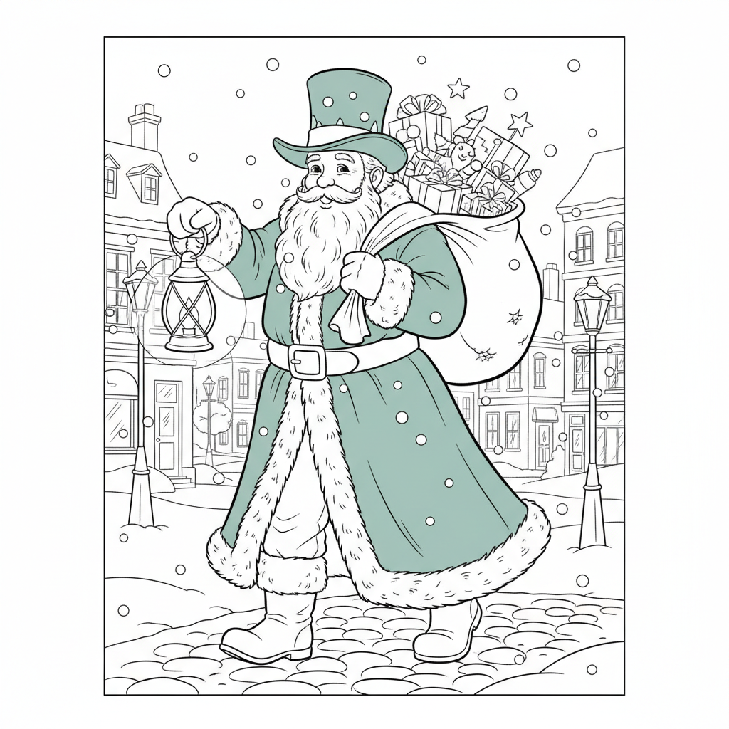 A delightful santa coloring page featuring Victorian era Santa in long green coat carrying lantern through snowy cobblestone street. Perfect for kids and adults who love coloring!