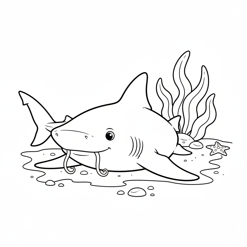 A delightful shark coloring page featuring nurse shark bottom dwelling gentle calm resting. Perfect for kids and adults who love coloring!