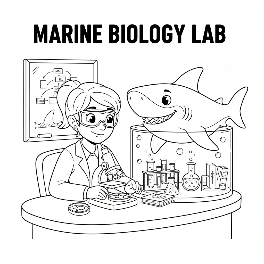 A delightful shark coloring page featuring shark scientist researching studying marine biology lab. Perfect for kids and adults who love coloring!