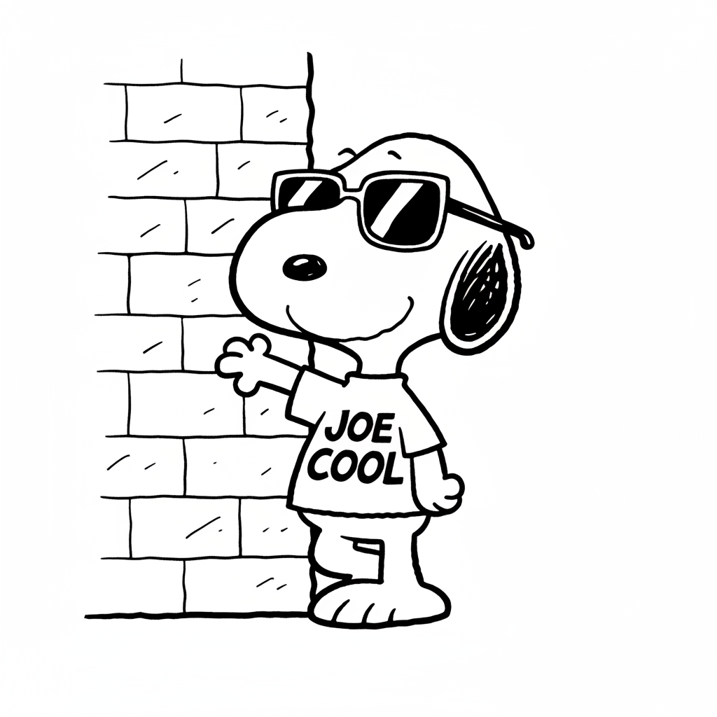 A delightful snoopy coloring page featuring Snoopy dressed as Joe Cool wearing sunglasses leaning casually. Perfect for kids and adults who love coloring!