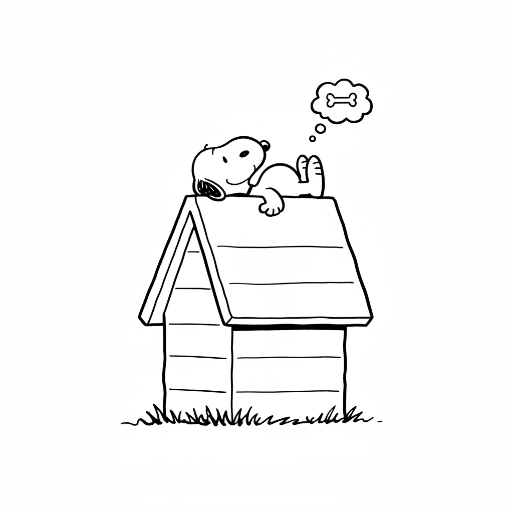 A delightful snoopy coloring page featuring Snoopy lying on top of his red doghouse daydreaming peacefully. Perfect for kids and adults who love coloring!