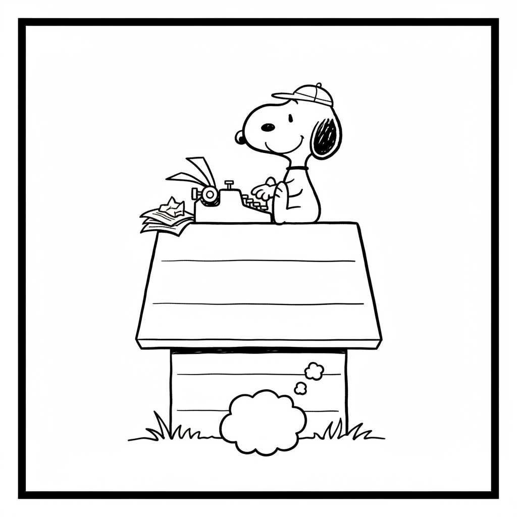 A delightful snoopy coloring page featuring Snoopy typing on typewriter on top of his doghouse. Perfect for kids and adults who love coloring!