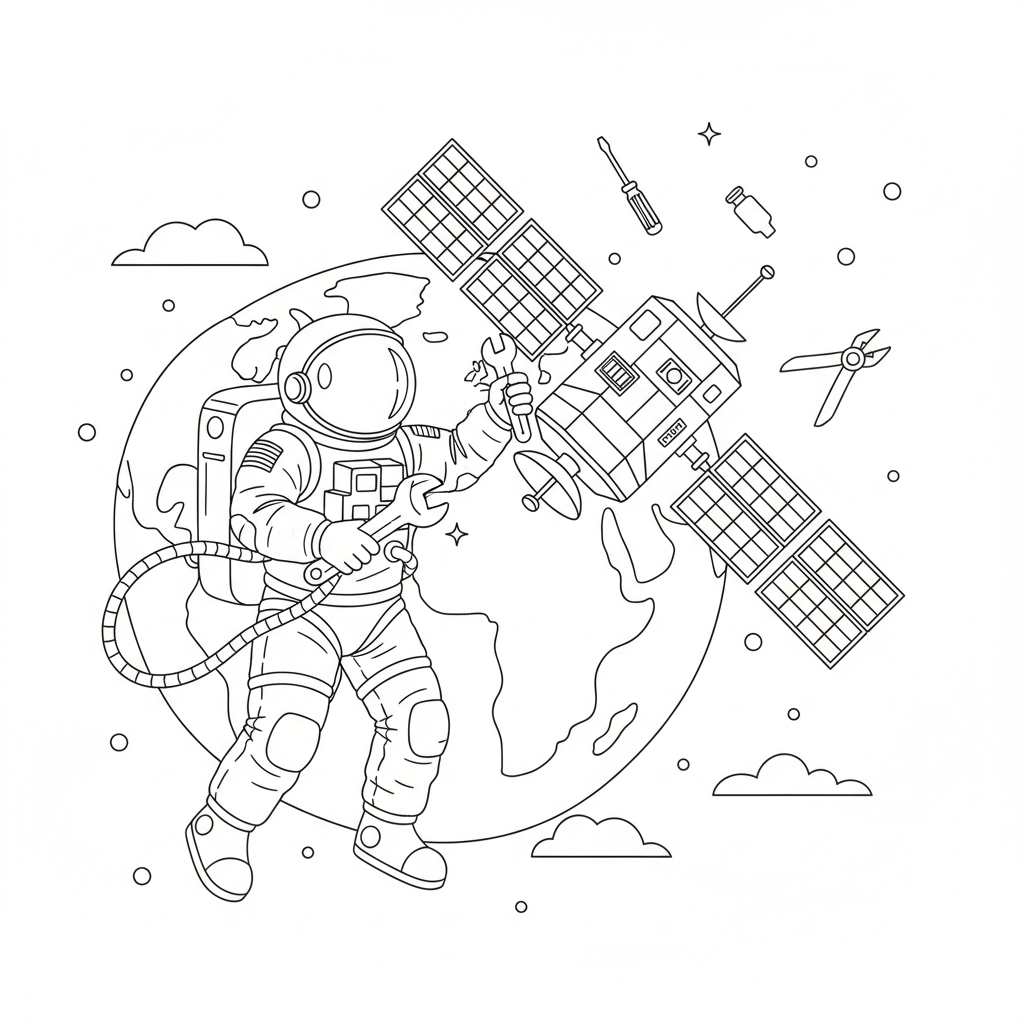 A delightful space coloring page featuring astronaut doing a spacewalk repairing a satellite with tools floating. Perfect for kids and adults who love coloring!