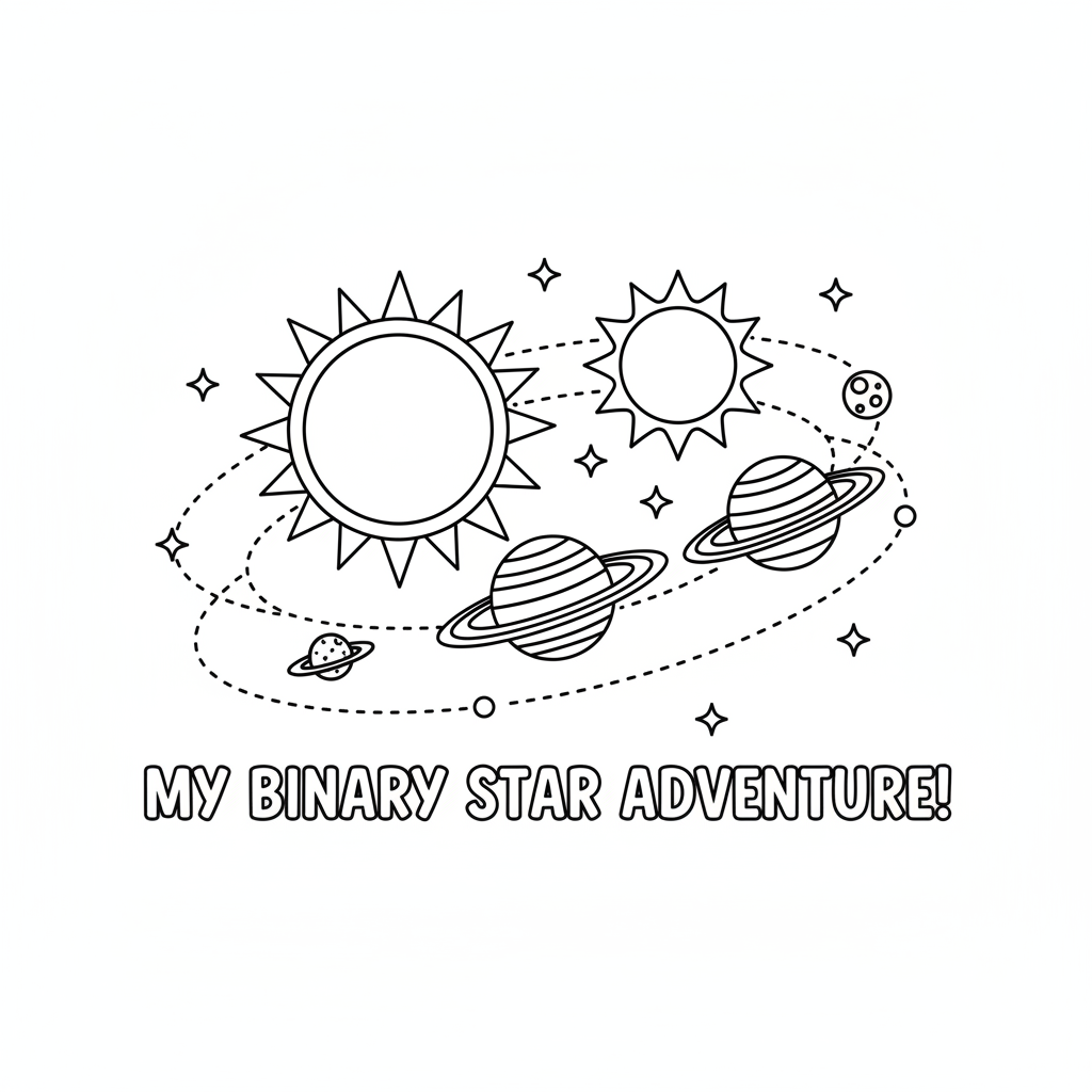 A delightful space coloring page featuring binary star system with two suns and planets orbiting between them. Perfect for kids and adults who love coloring!
