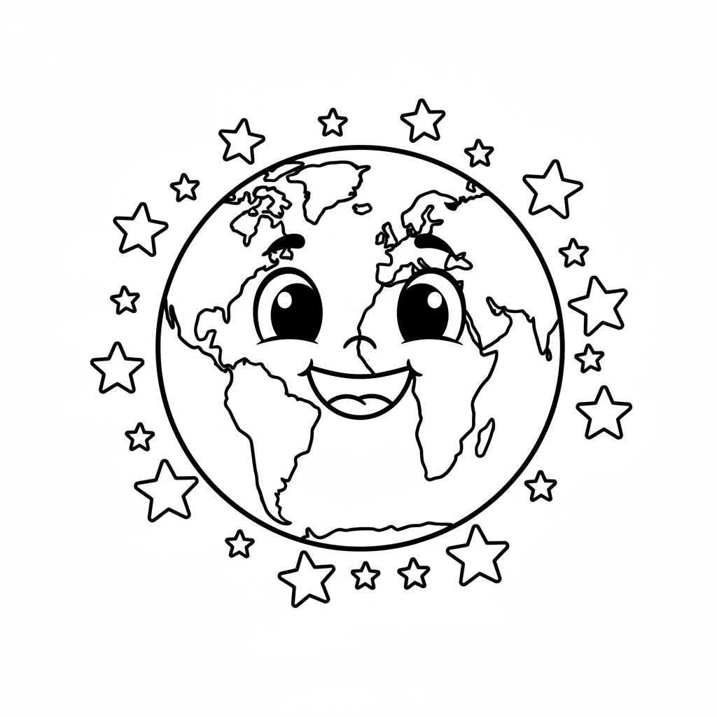 A delightful space coloring page featuring cartoon Earth with a smiley face surrounded by tiny stars. Perfect for kids and adults who love coloring!