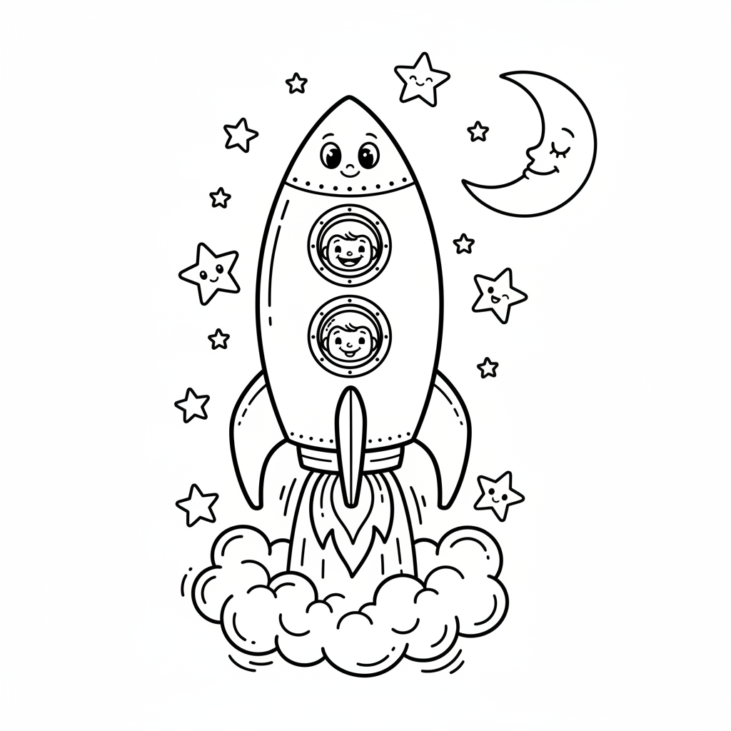 A delightful space coloring page featuring cute cartoon rocket ship blasting off with stars and a smiling moon. Perfect for kids and adults who love coloring!