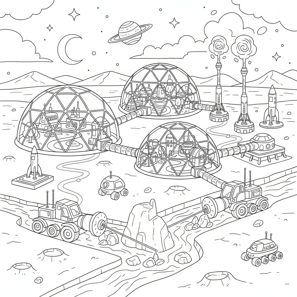 A delightful space coloring page featuring futuristic space colony on Mars with dome habitats and terraforming equipment. Perfect for kids and adults who love coloring!
