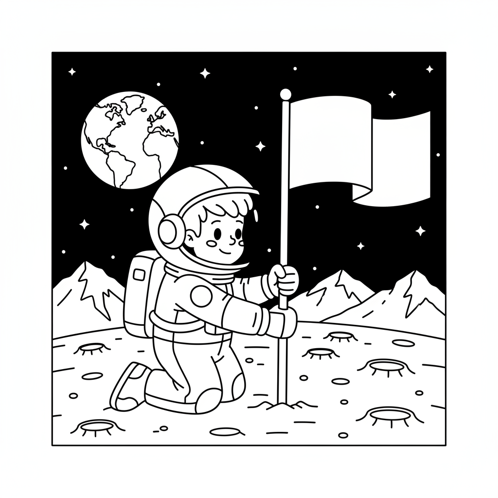 A delightful space coloring page featuring little astronaut planting a flag on the moon surface. Perfect for kids and adults who love coloring!