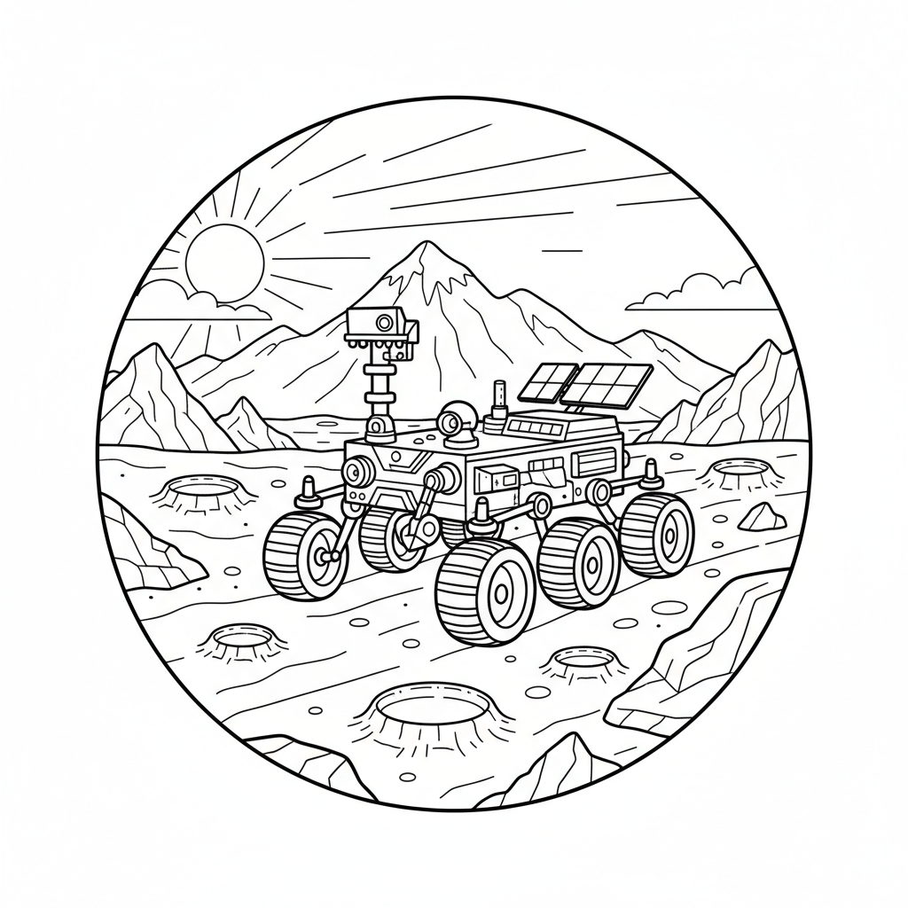 A delightful space coloring page featuring Mars rover exploring the red planet surface with rocks and craters. Perfect for kids and adults who love coloring!