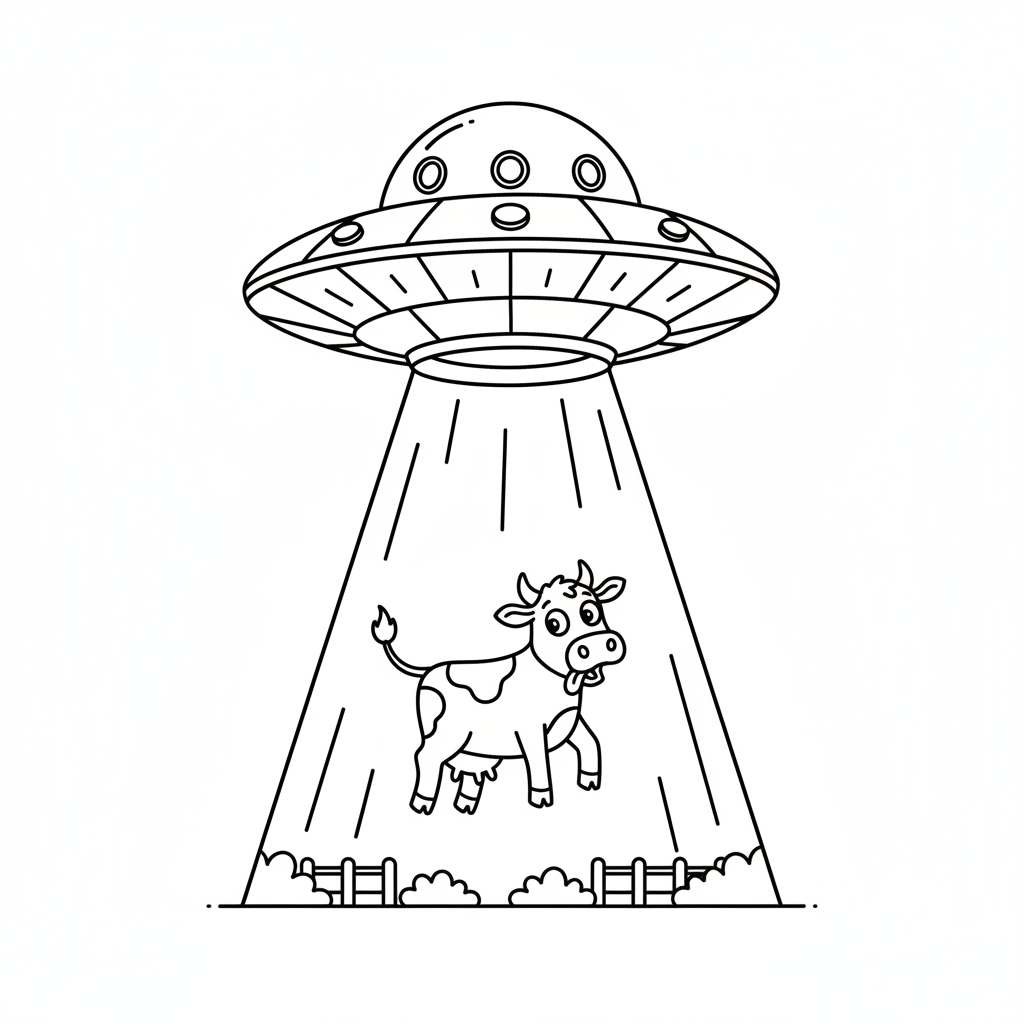 A delightful space coloring page featuring UFO beaming up a cartoon cow with surprised expression. Perfect for kids and adults who love coloring!