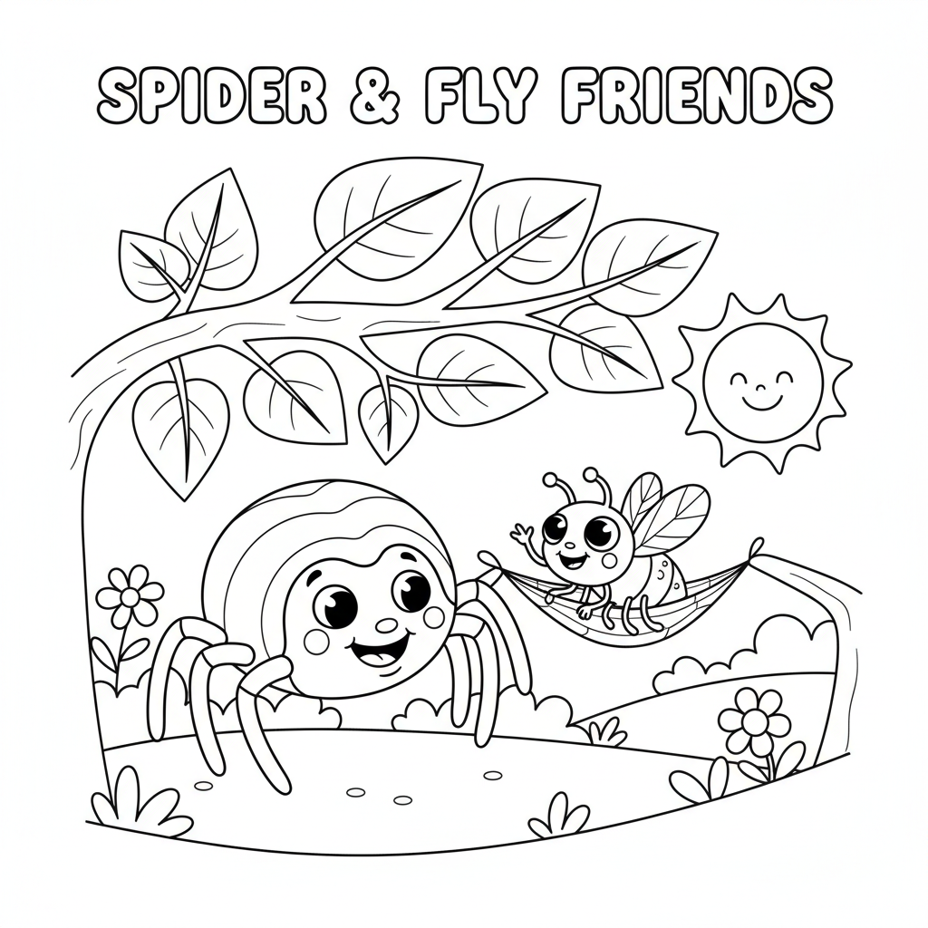 A delightful spider coloring page featuring spider and fly friends unlikely cartoon story. Perfect for kids and adults who love coloring!