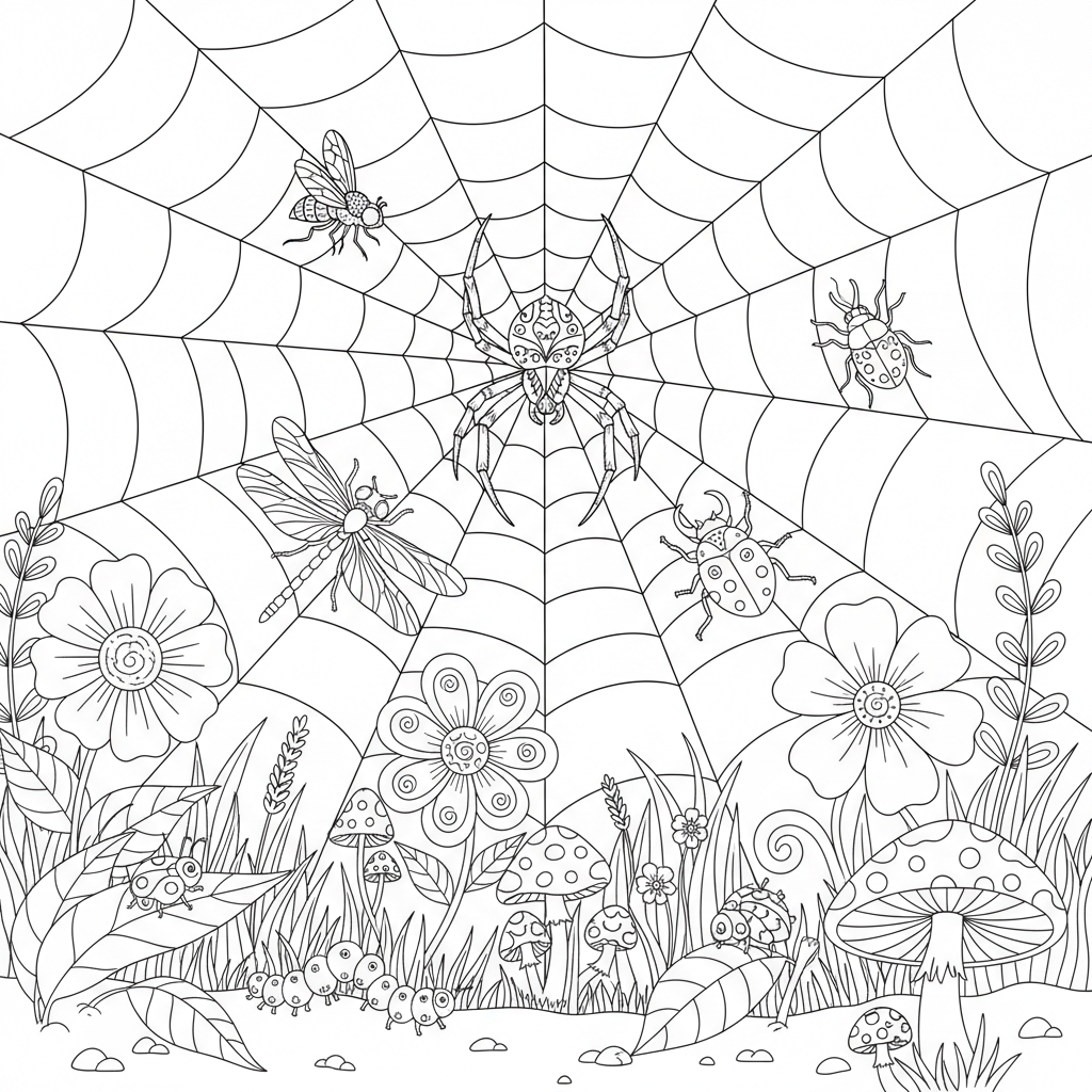Beautiful spider and insect scene coloring page for kids and adults. Free to download and print.