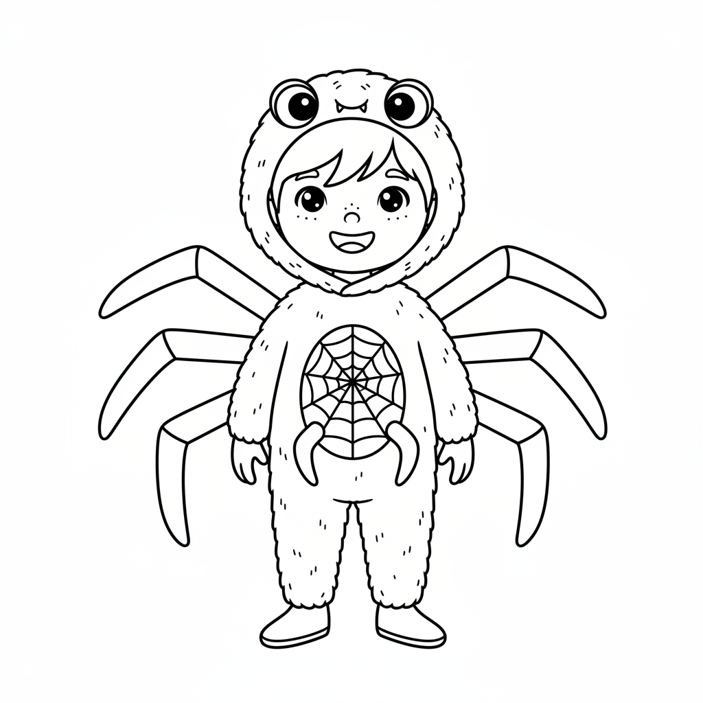 A delightful spider coloring page featuring spider Halloween costume child wearing eight legs. Perfect for kids and adults who love coloring!