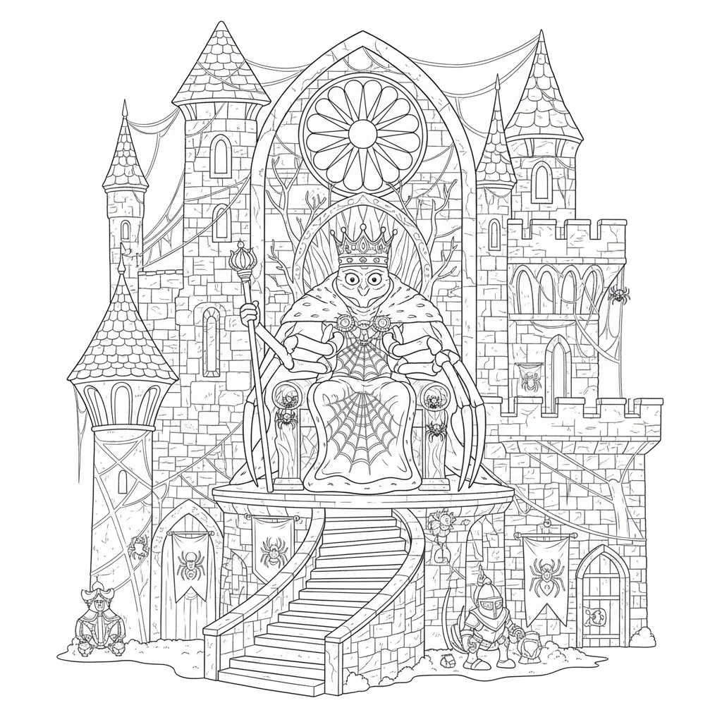 Beautiful spider king in castle coloring page for kids and adults. Free to download and print.