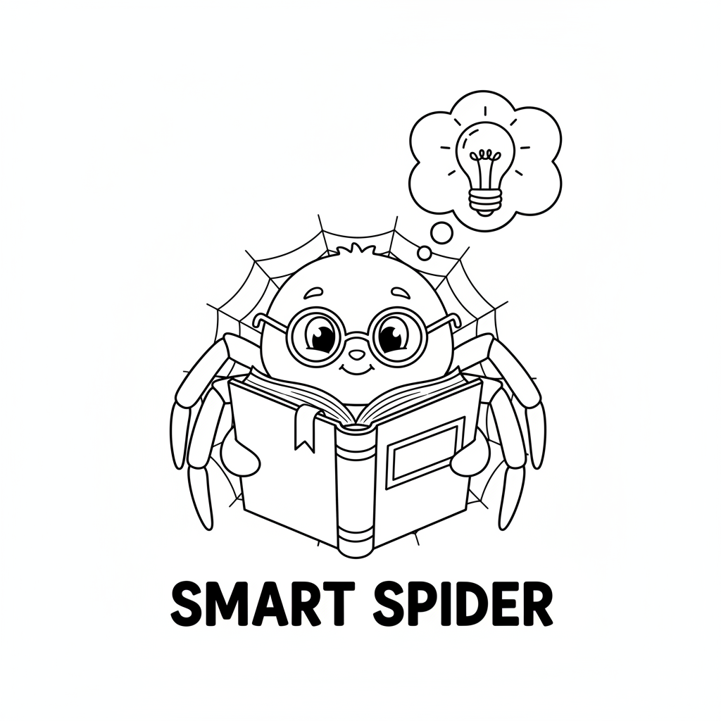 A delightful spider coloring page featuring spider reading book tiny glasses intellectual smart. Perfect for kids and adults who love coloring!