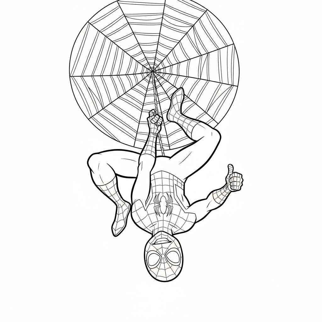 A delightful spidey coloring page featuring Spidey hanging upside down from web playful pose. Perfect for kids and adults who love coloring!