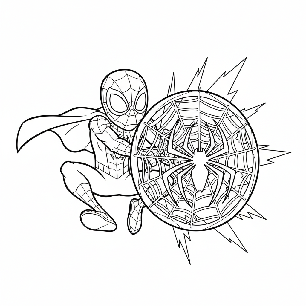 A delightful spidey coloring page featuring Spidey using web to create a shield protection. Perfect for kids and adults who love coloring!