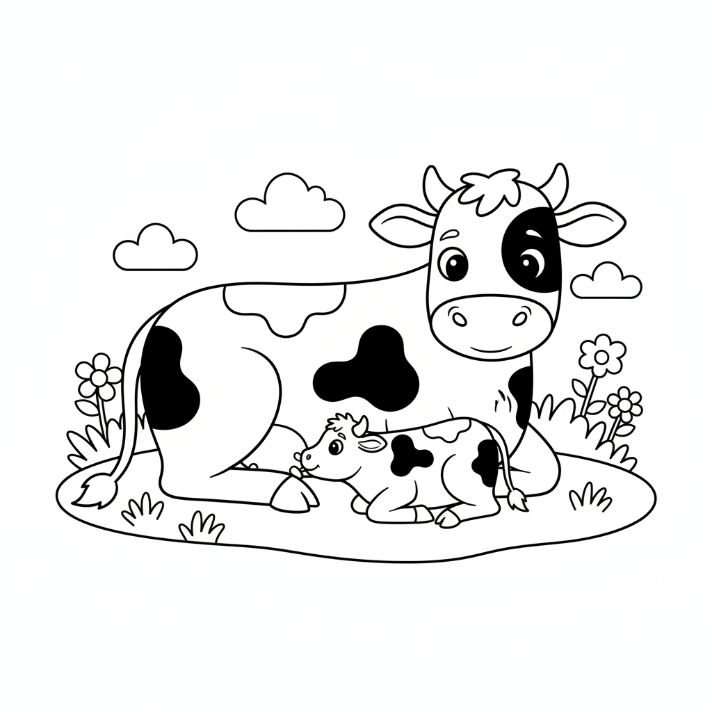 A delightful spring coloring page featuring baby calf with mother cow nursing. Perfect for kids and adults who love coloring!