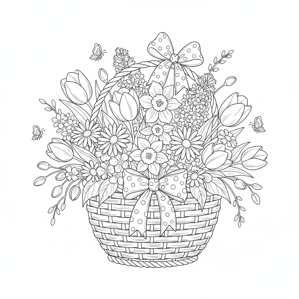 Beautiful flower bouquet in spring basket coloring page for kids and adults. Free to download and print.