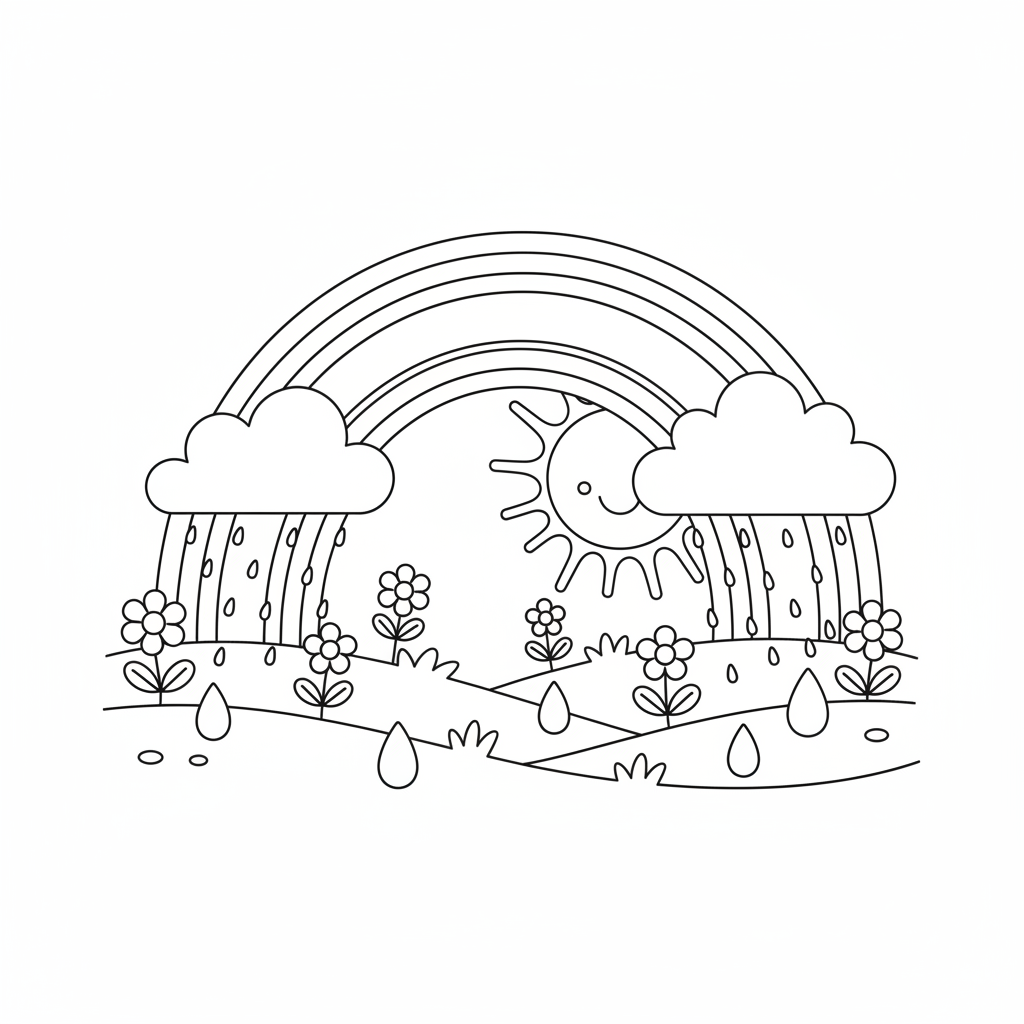 A delightful spring coloring page featuring rainbow after spring rain beautiful arc. Perfect for kids and adults who love coloring!