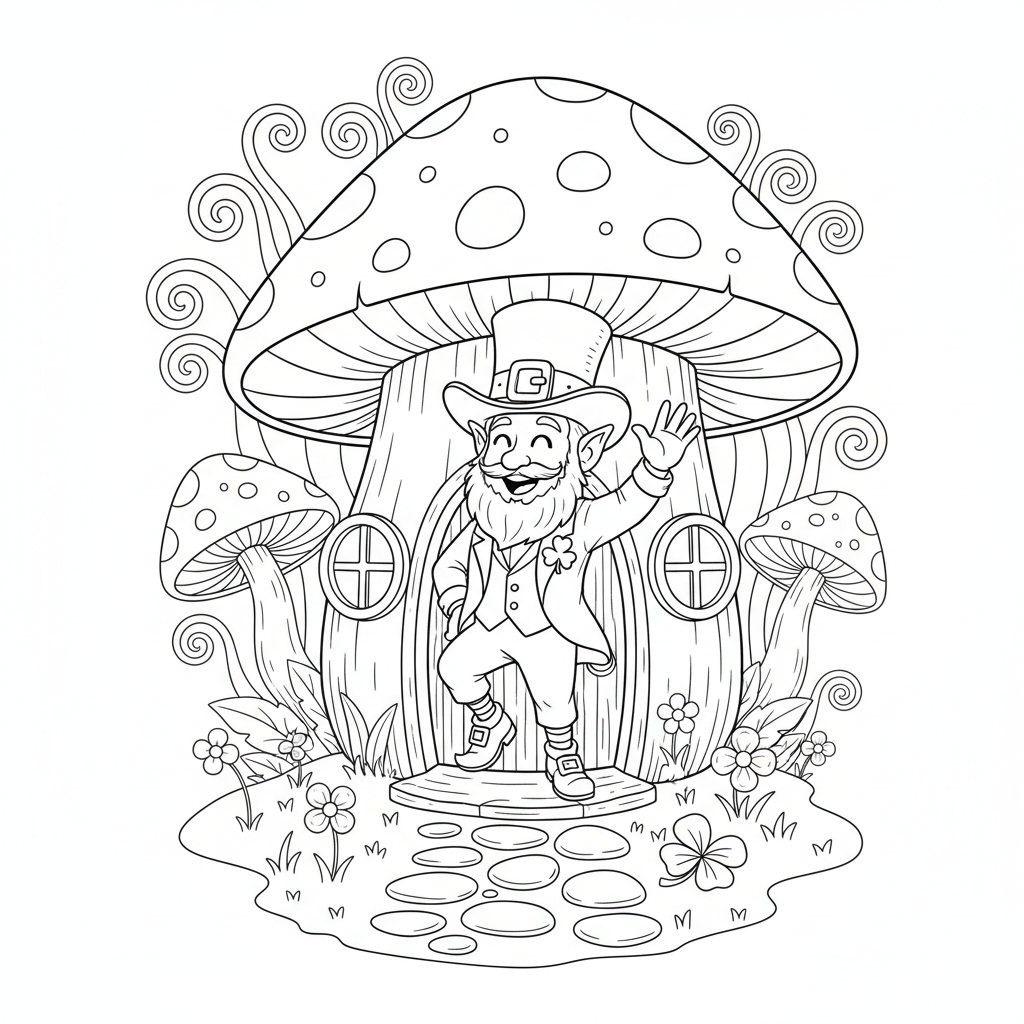 Beautiful leprechaun waving from doorway of tiny mushroom house coloring page for kids and adults. Free to download and print.