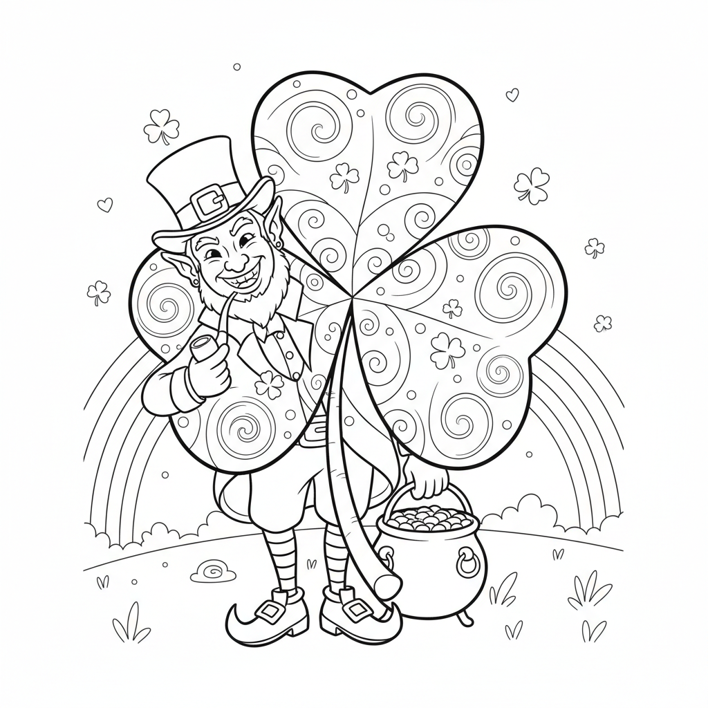 Beautiful mischievous leprechaun hiding behind giant shamrock coloring page for kids and adults. Free to download and print.