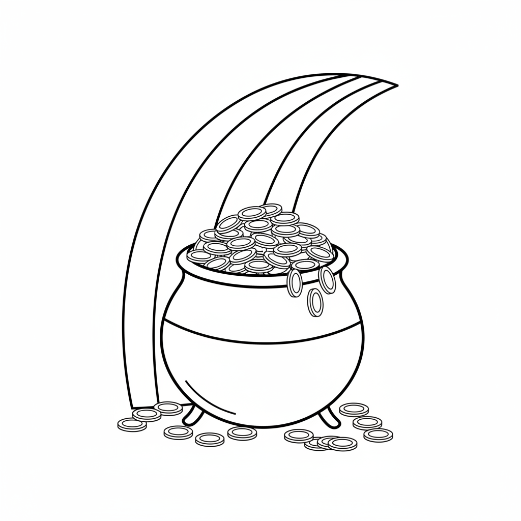 A delightful st patrick's day coloring page featuring pot of gold end of rainbow coins overflowing treasure. Perfect for kids and adults who love coloring!