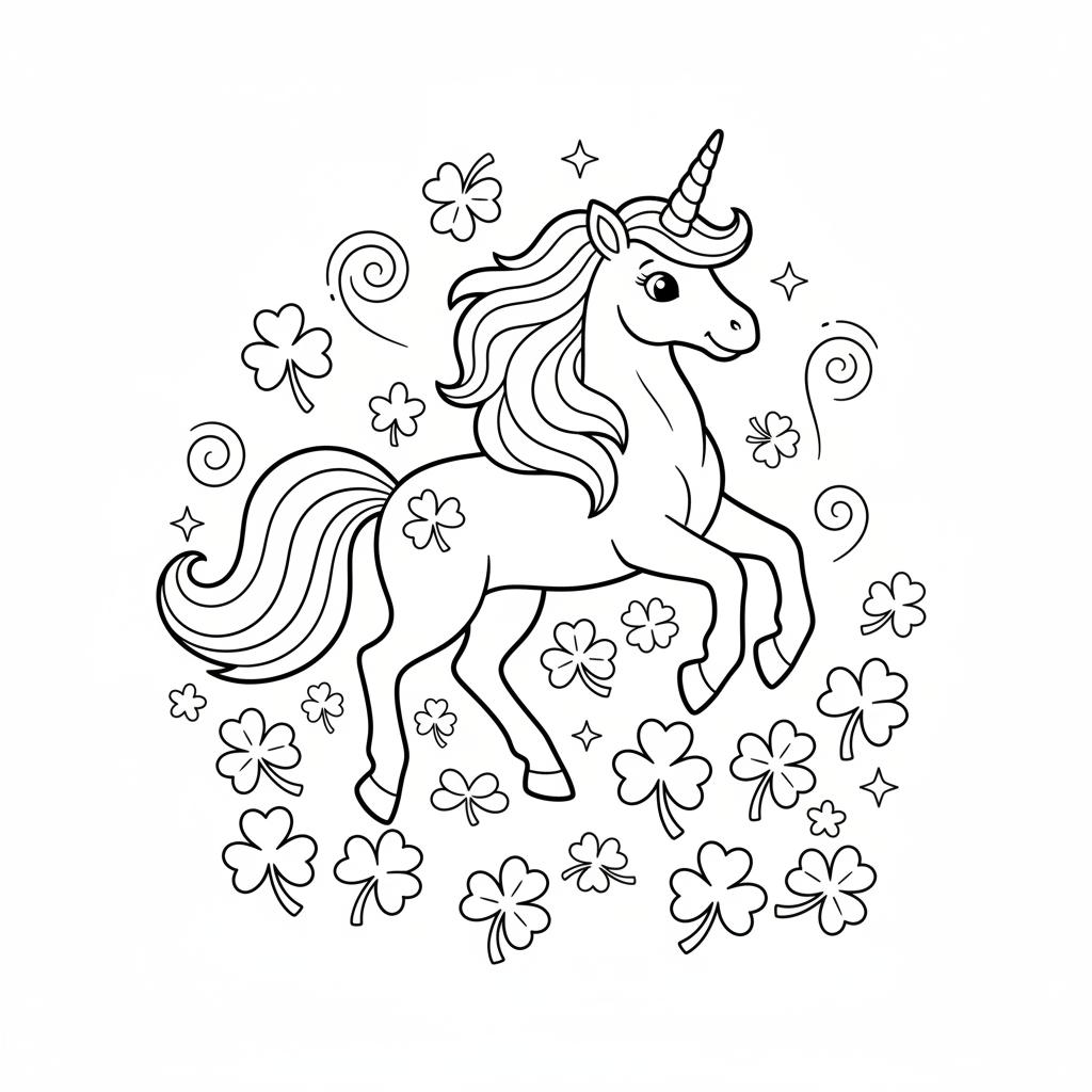 A delightful st patrick's day coloring page featuring rainbow unicorn prancing field shamrocks magical creature. Perfect for kids and adults who love coloring!