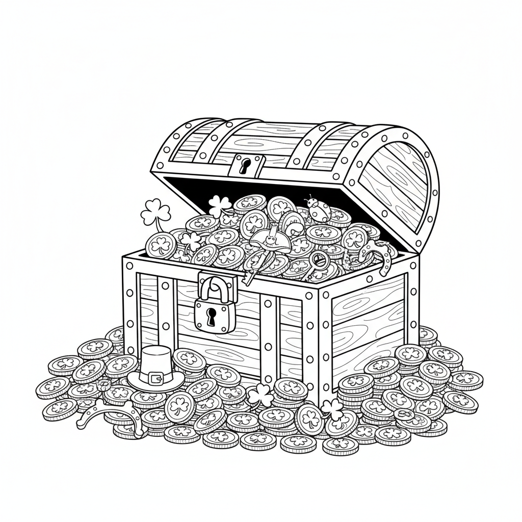 A delightful st patrick's day coloring page featuring treasure chest filled gold coins lucky charms. Perfect for kids and adults who love coloring!