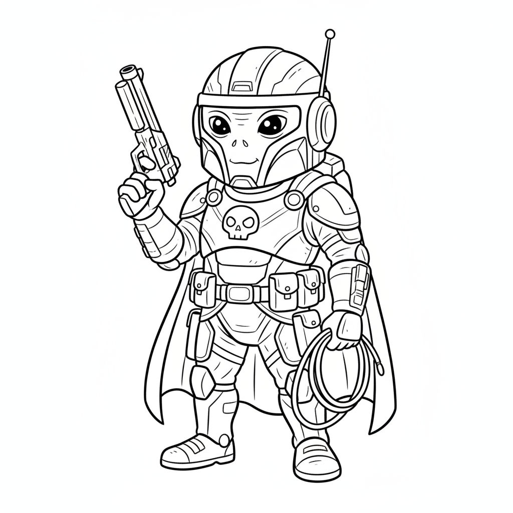 An original AI-generated fan art coloring page inspired by star wars, featuring a green-skinned alien bounty hunter in armored suit. This is unofficial fan art, not affiliated with the original creators. Perfect for kids and adults who love coloring!