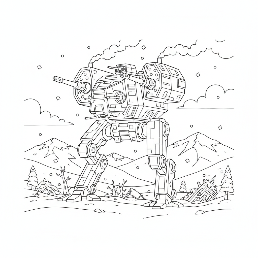 An original AI-generated fan art coloring page inspired by star wars, featuring a large walking armored transport vehicle on snowy battlefield. This is unofficial fan art, not affiliated with the original creators. Perfect for kids and adults who love coloring!