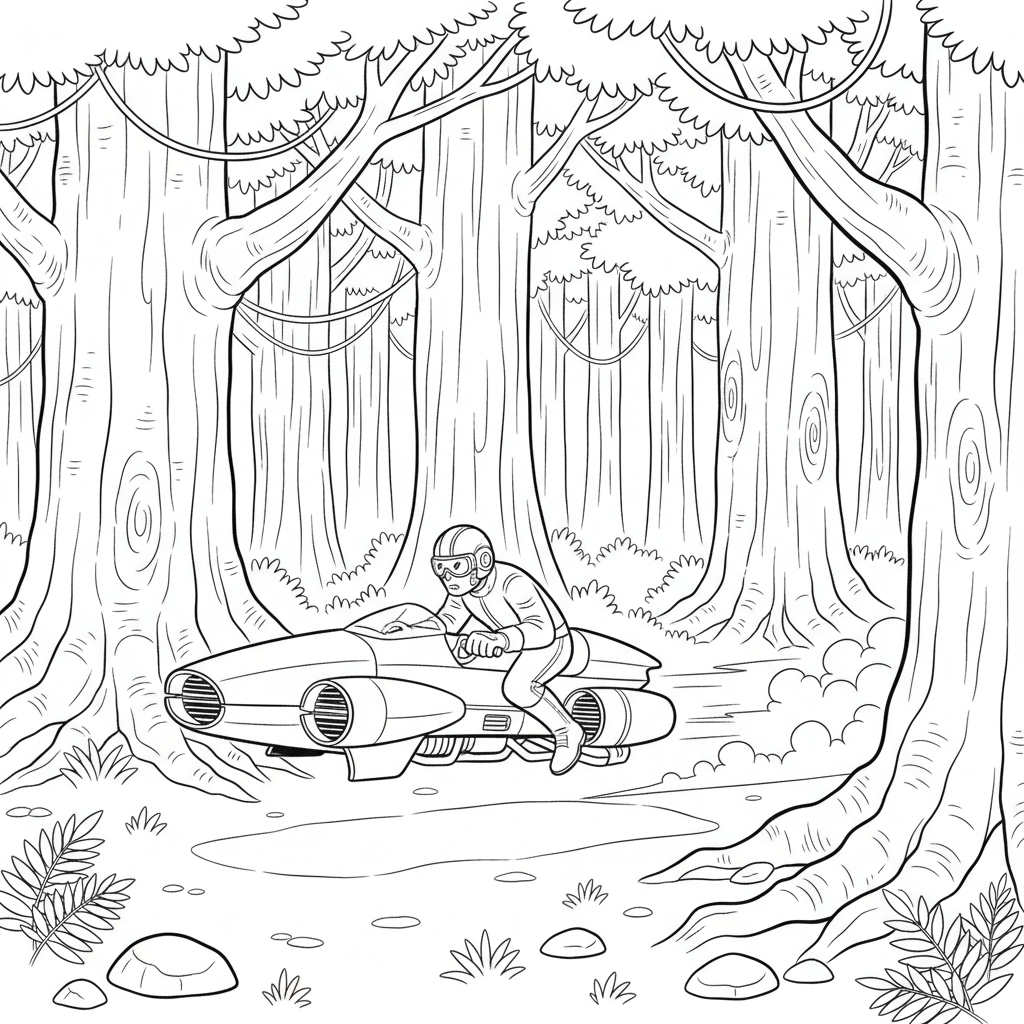 An original AI-generated fan art coloring page inspired by star wars, featuring a speeder bike racing through dense forest of giant trees. This is unofficial fan art, not affiliated with the original creators. Perfect for kids and adults who love coloring!