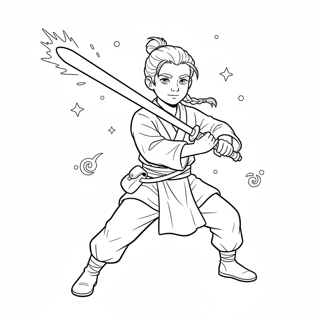 An original AI-generated fan art coloring page inspired by star wars, featuring a young padawan learner training with practice energy sword. This is unofficial fan art, not affiliated with the original creators. Perfect for kids and adults who love coloring!
